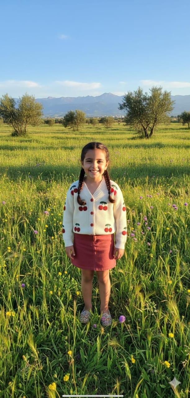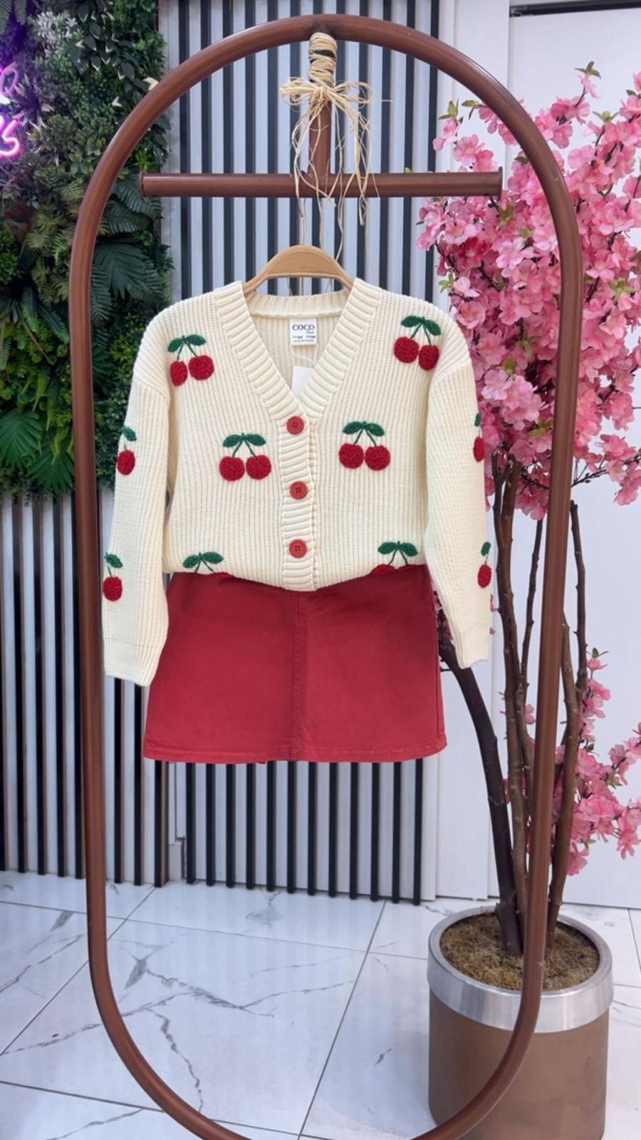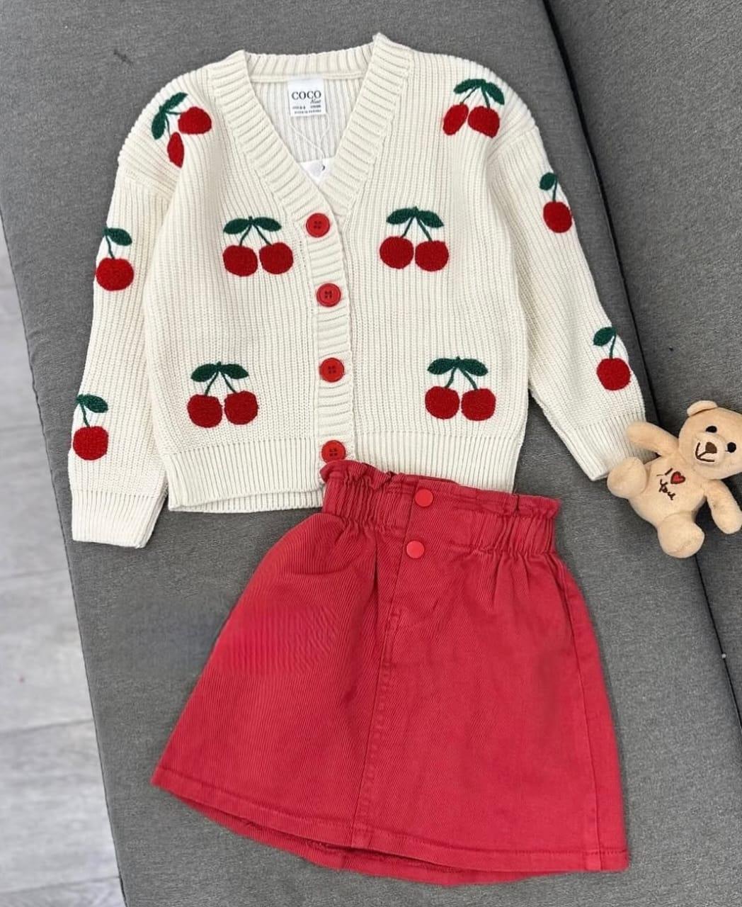 Ensemble 2 pièces : Cardigan en laine avec motif cerise et jupe en denim rouge