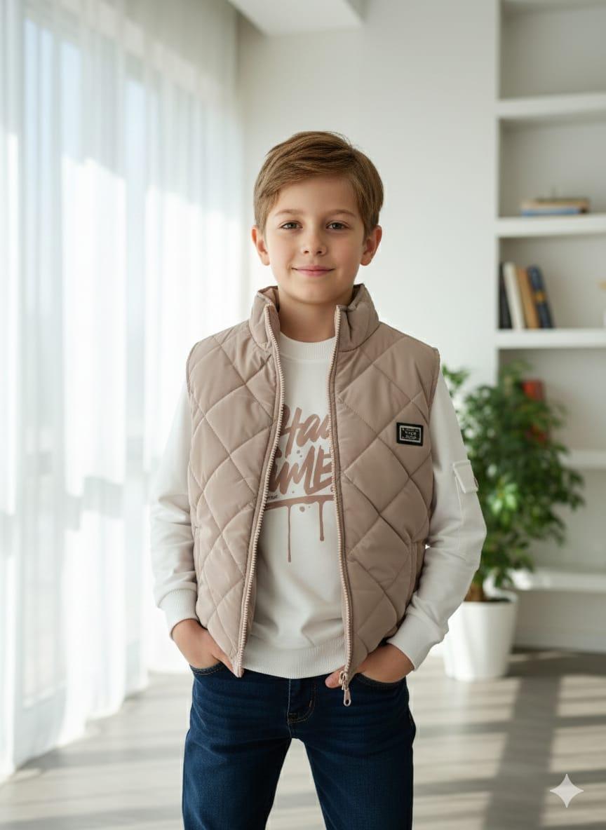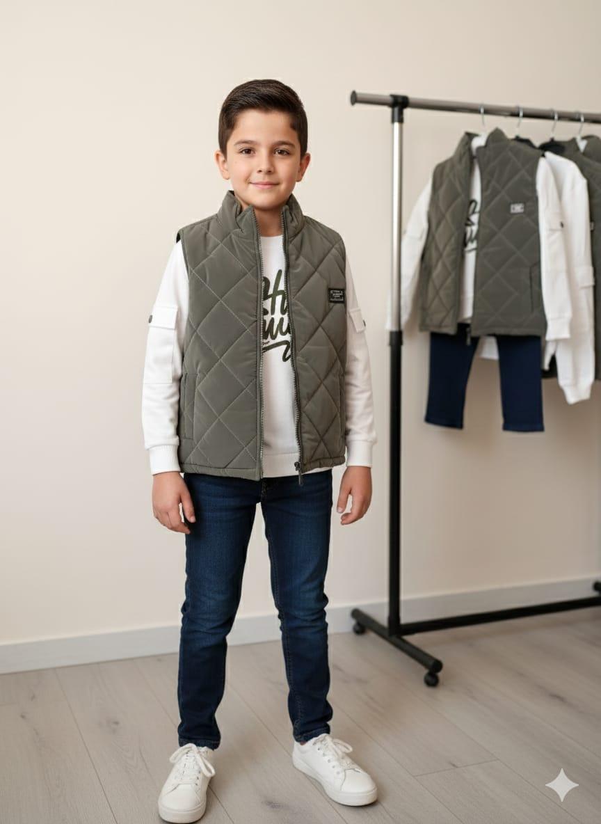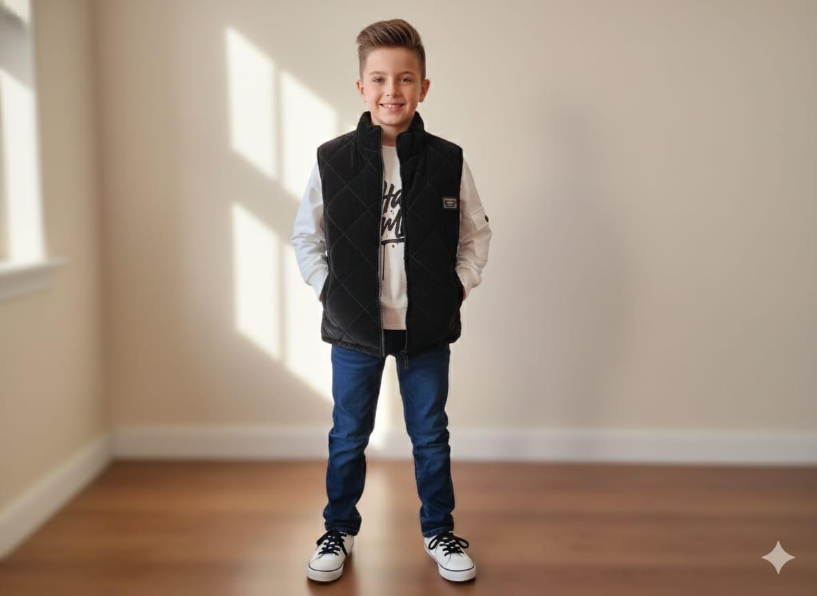 Gilet doudoune + pull avec motif imprimé + pantalon en jean