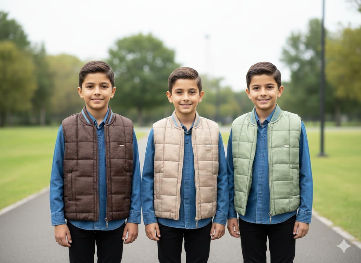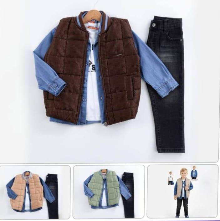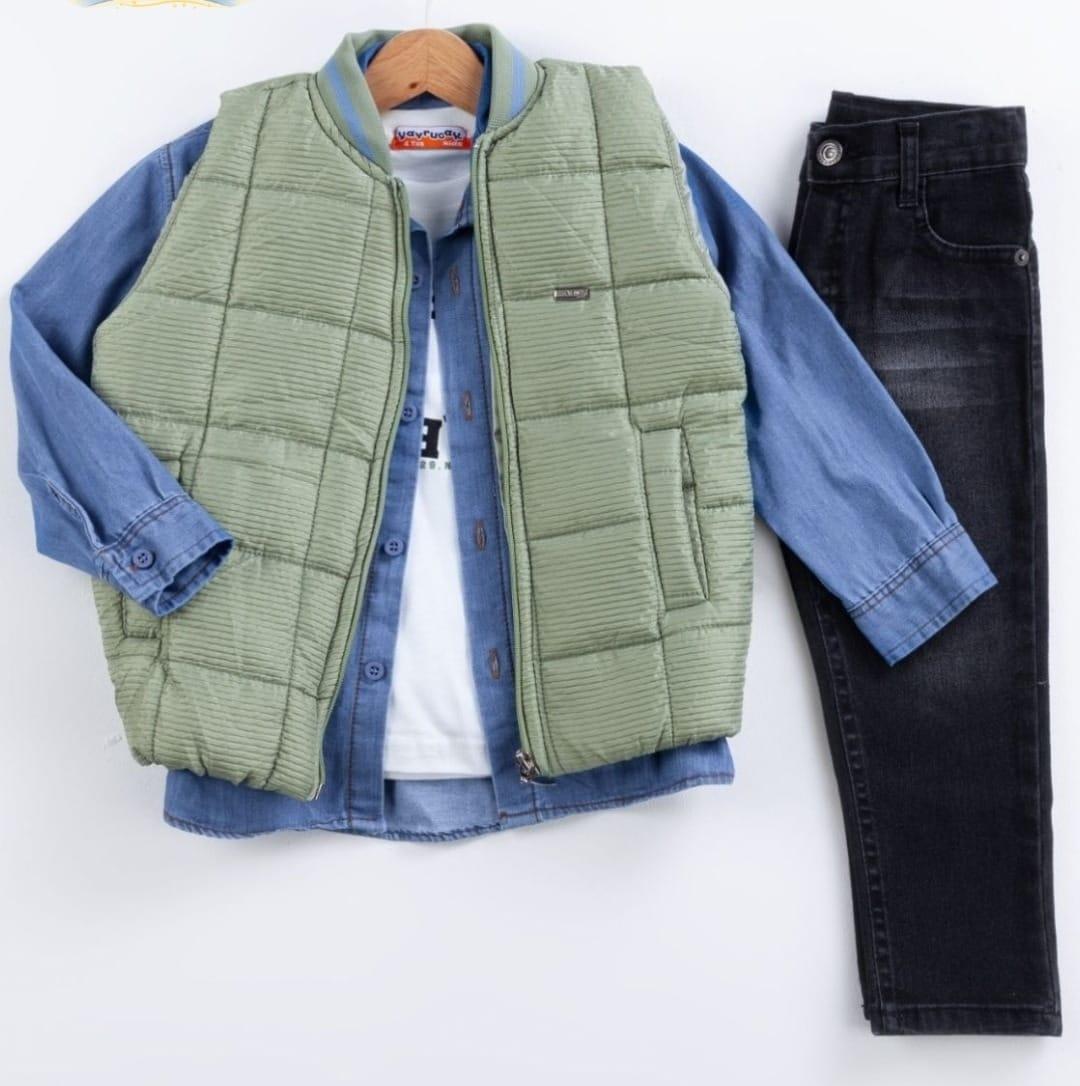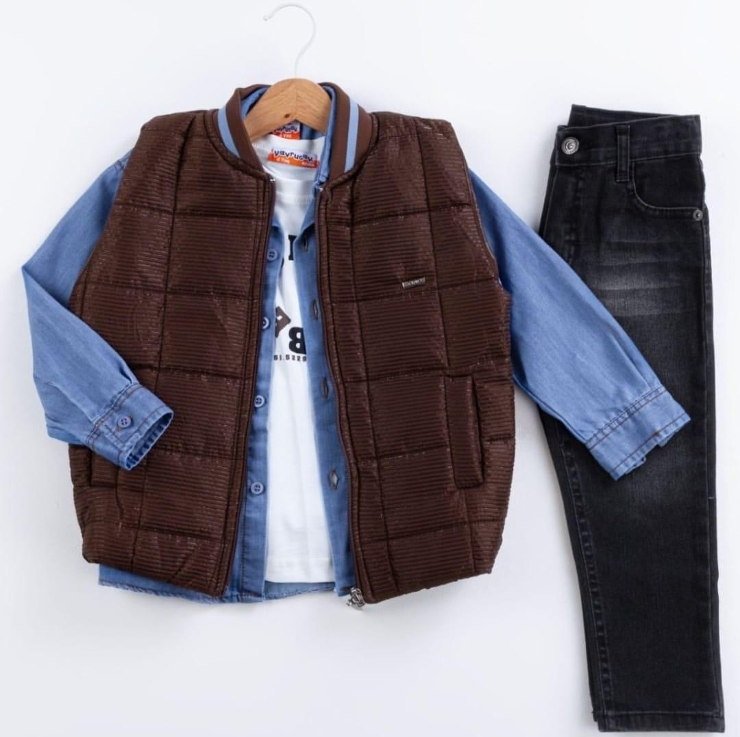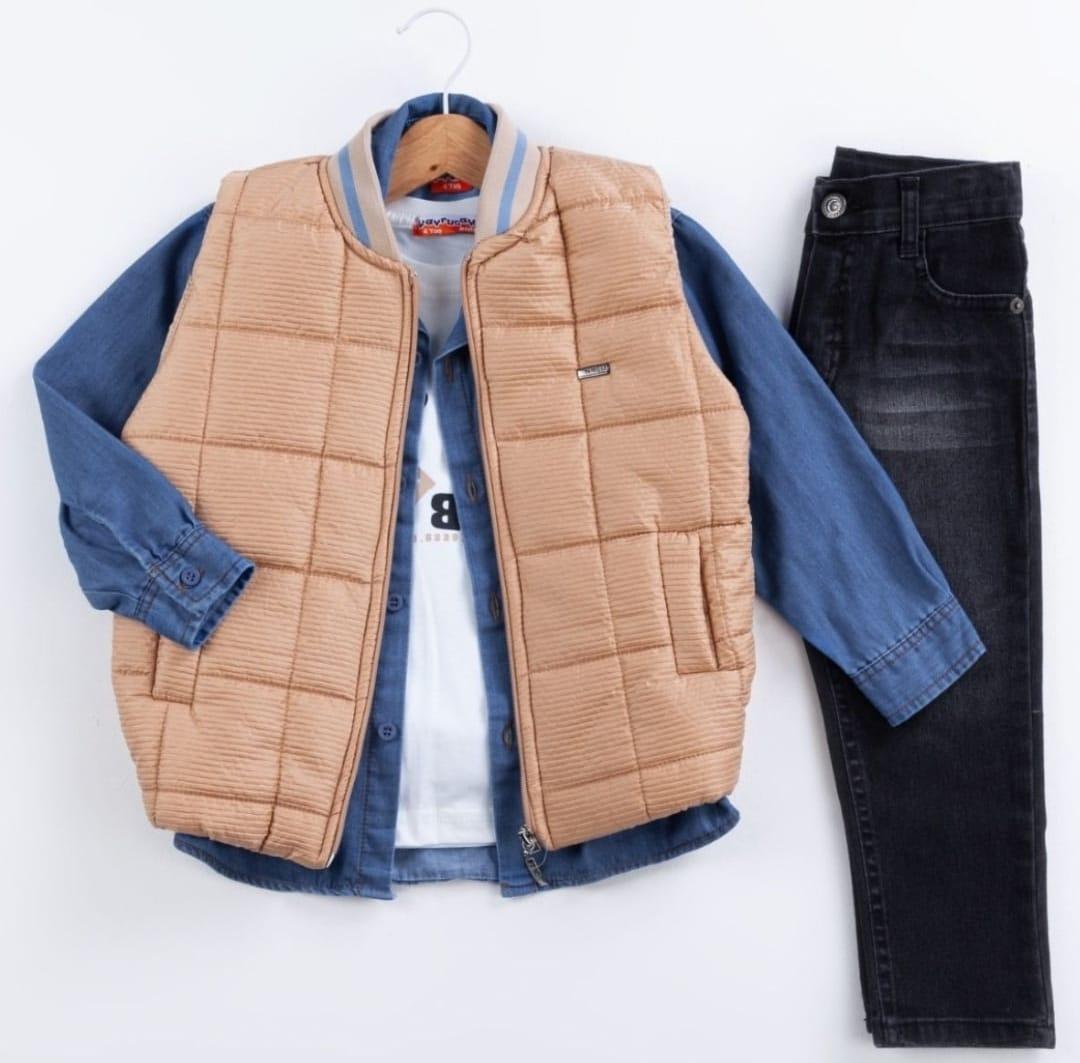 Tenue de 4 pièces : Gilet + body avec manches longues en coton + chemise en denim bleu léger et pantalon en jean noir