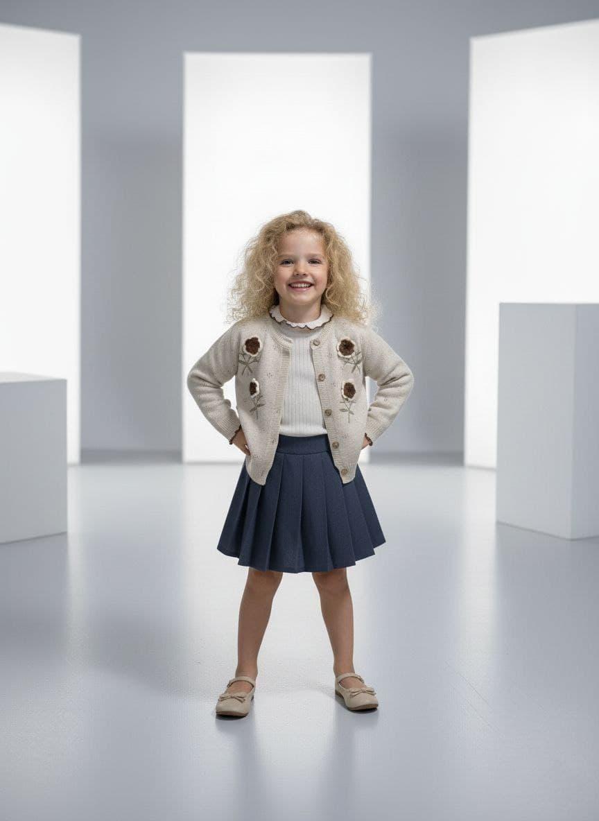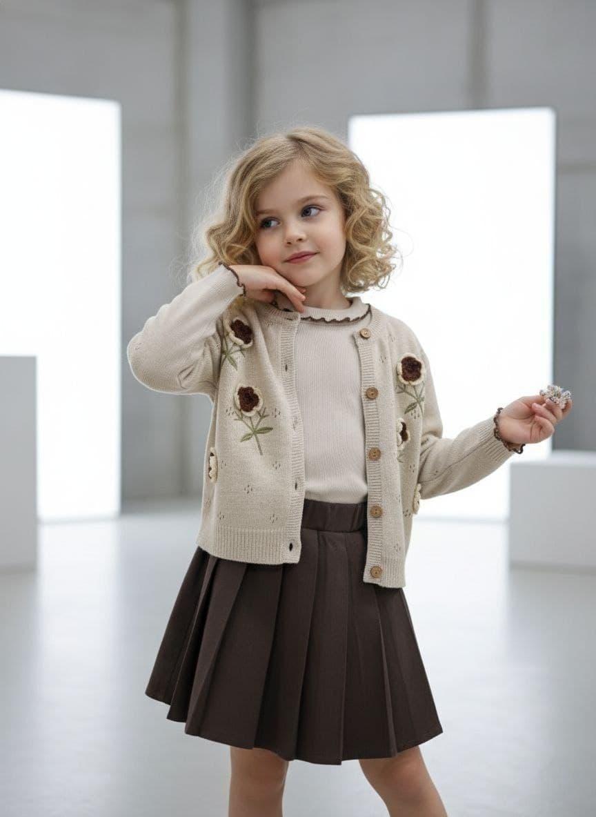 Cardigan en tricot avec motif fleur en crochet et body + jupe en lin doublé
